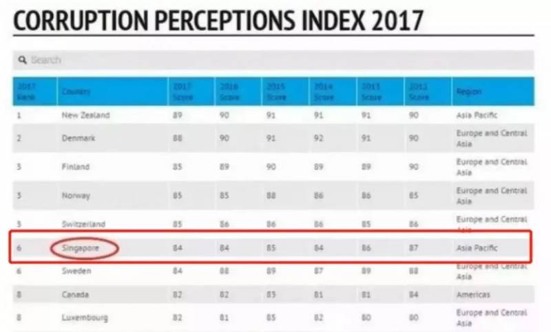 根据透明国际(Transparency International)公布的2017年廉洁指数,新加坡取得84分的成绩,与2016年相同,名次上升一级,与瑞典并肩为全球第六大最清廉的国家。