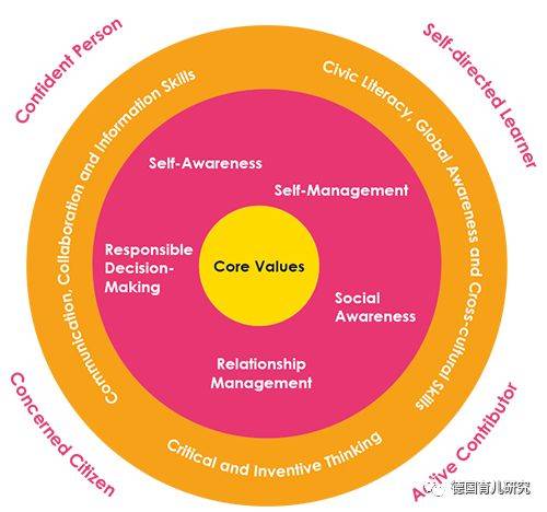中间环表示社会与情绪能力(Social and Emotional Competencies):自我意识,识别和管理情绪的能力,对他人的关怀,做负责任的决定,建立积极的人际关系,以及有效地处理具有挑战性的情形。
