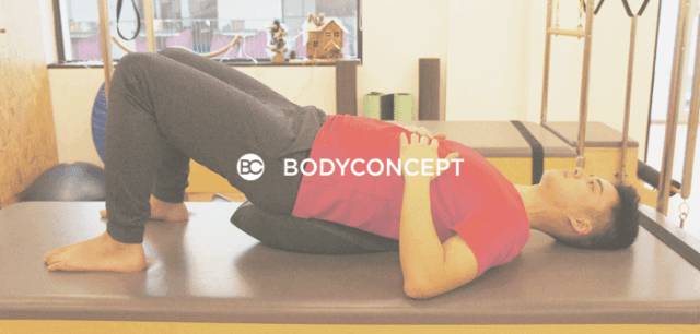 • 呼气时,将脊柱分节的向上卷起。停留在桥式,再呼气,让脊柱一节一节地卷回垫上。