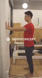 • 面向墙壁或镜子,双手贴墙·并打开与肩同宽。