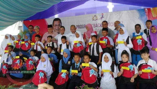 鄂图曼(后排左4)颁发上学用品及礼券给受惠的中小学生,后排左起莫哈末库占、颜碧贞、阿米诺胡达及沙哈鲁丁(右4)。