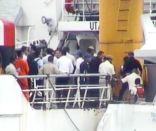 柔佛州务大臣鄂图曼沙比安在一群人陪同下,登上Pedoman号。(新加坡警察部队提供)