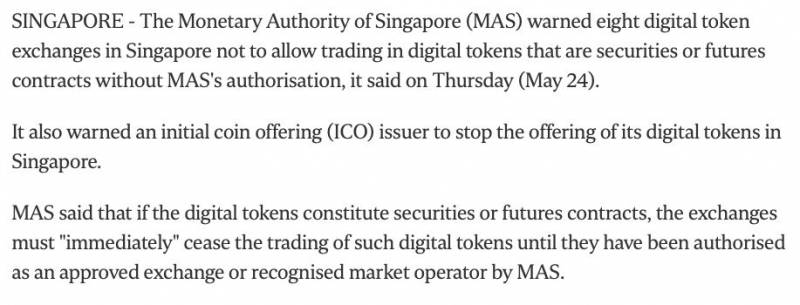 话说回来, 新加坡金融管理局(MAS)在2017年时表示过,新加坡的 8 家数字代币交易所因为没有得到该局授权的情况下,因而不允许进行证券或期货合约等数字代币交易。该局还禁止了一家 ICO 发行方在新加坡发行数字代币。