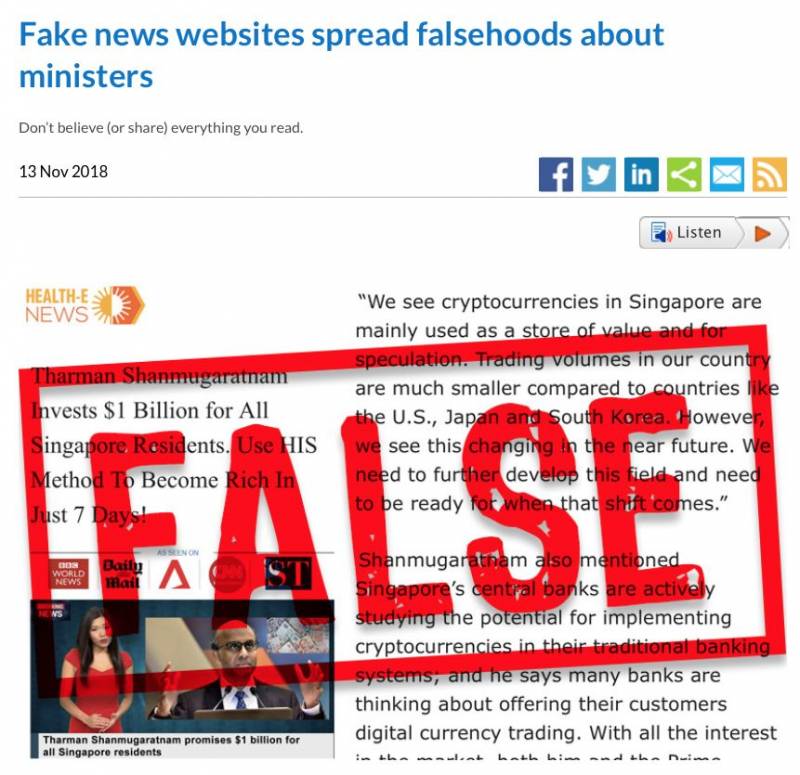 在2018年下半年,有两个欺诈网站捏造新加坡副总理兼经济及社会政策统筹部长尚达曼的言论,企图招揽公众投资比特币,新加坡金融管理局吁请新加坡国人提高警惕。