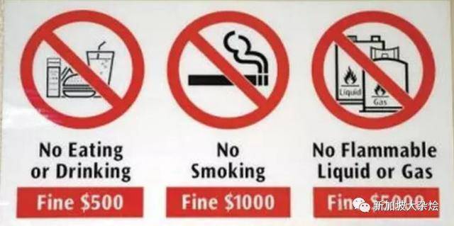 新加坡的高额罚款更多是起一种威慑作用。以新加坡的地铁为例,到处可以看到各种禁止标志。所有的禁止标志都将罚款金额明明白白地写了出来,而罚款的额度也是令人咋舌。比如,携带易燃物品的罚金高达5000元新币折合大约25000人民币,吸烟的罚款是1000元新币(5000人民币),而喝饮料与吃东西最高可能被罚500元新币。