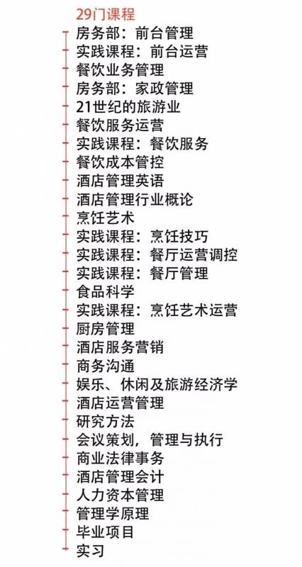 这个专业涵盖的知识领域非常的全面,学生要在在18个月内完成28门理论及实践课程 (加6个月带薪实习共29门课程)。课程门类从前台运营、基础烹饪、餐厅管理到商务沟通、酒店营销、人力管理,要的就是让学生在毕业后成为受企业欢迎的综合型人才。