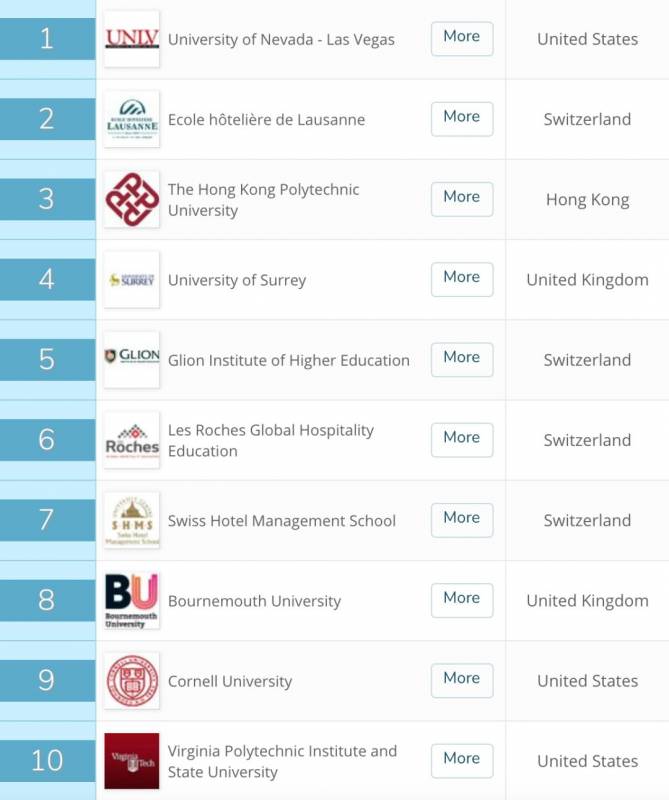 瑞士酒店管理是世界最知名的,教学水准也是公认最高的。瞧,下图是 2018 QS 世界大学酒店管理专业的排名。在前10名中,瑞士以40%的打榜率甩其它国家好几条街,稳居世界前列。