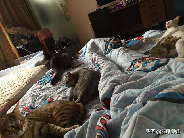 众猫日常压床,给铲屎的暖腿~ 铲屎的表示这一晚上都不敢动,睡得腰酸背痛腿抽筋的~