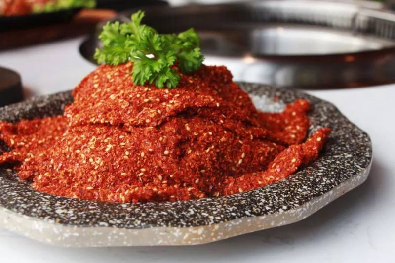 辣椒经过反复地捶擂,味道渗透在牛肉之中