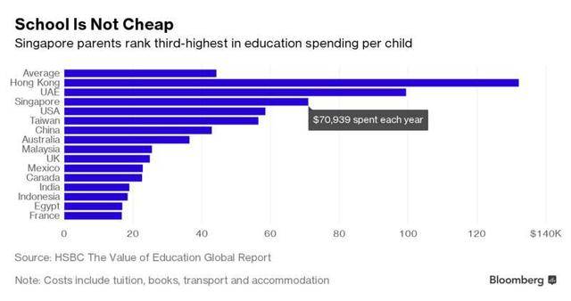 学校的天差地别,也导致了新加坡父母为了孩子能够不落于人后,而不惜代价——在新加坡教育支出占到公共财政17%的当下,根据统计,新加坡家庭在单个孩子上的教育支出上竟然高达七万美金!