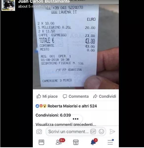 “我有一次在托斯卡纳,拿到了一个10人晚饭的小票,上面有一个根本不知道是什么的东西收费80欧元。当我问对方这是什么的时候,他们还讨论了一下,最后服务员过来跟我说,“搞错了!”|”