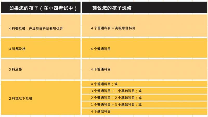 小四:学生参加学校组织的考试,并且依据考试成绩建议学生应选修的科目组合。 家长需要填写表格,根据孩子情况和考试成绩选择所要修读的科目组合。