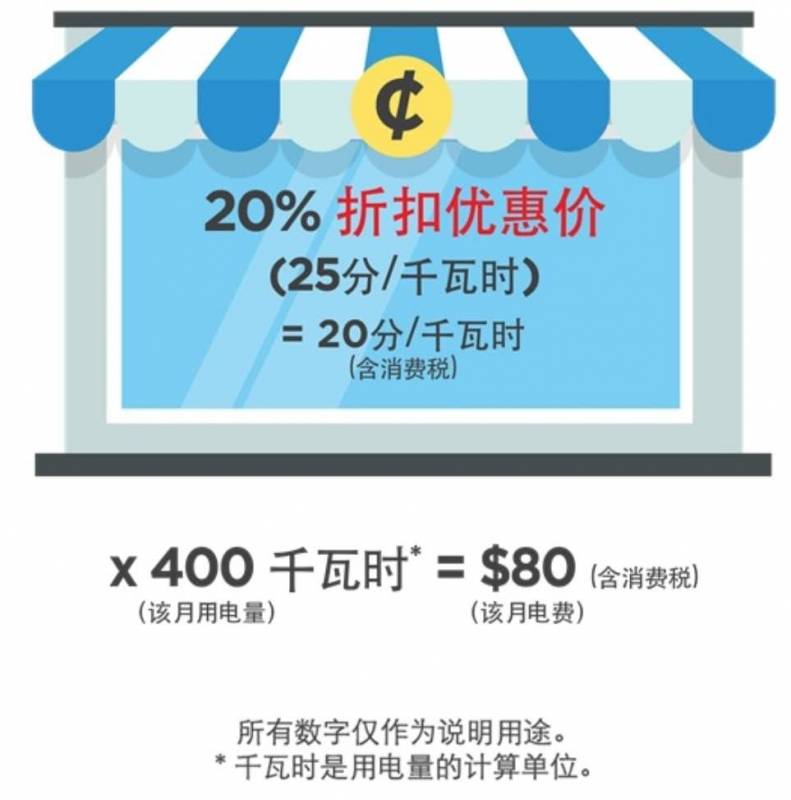 例如:如果您选择的配套享有20%的固定折扣优惠,若管制定价是每千瓦时25分(含消费税),该月用电量为400千瓦时,那么电费就是80元。