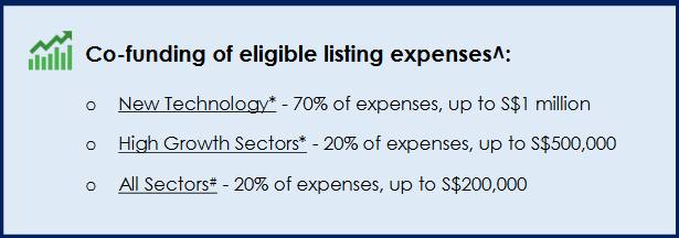 在该计划下,市值至少3亿元的新兴科技行业公司在新加坡交易所挂牌,可获得高达70%的上市费用资助(不超过100万元),这包括新兴金融科技、消费者数码科技、按需提供服务公司等。