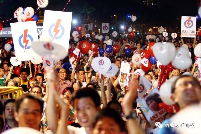 2015年大选人民行动党群众大会。人民行动党惹兰勿刹集选区竞选团队于9月9日在文庆路第4座组屋前草场举行竞选群众大会。行动党群众大会支持者拿着扇子和气球为候选人打气。(联合早报)