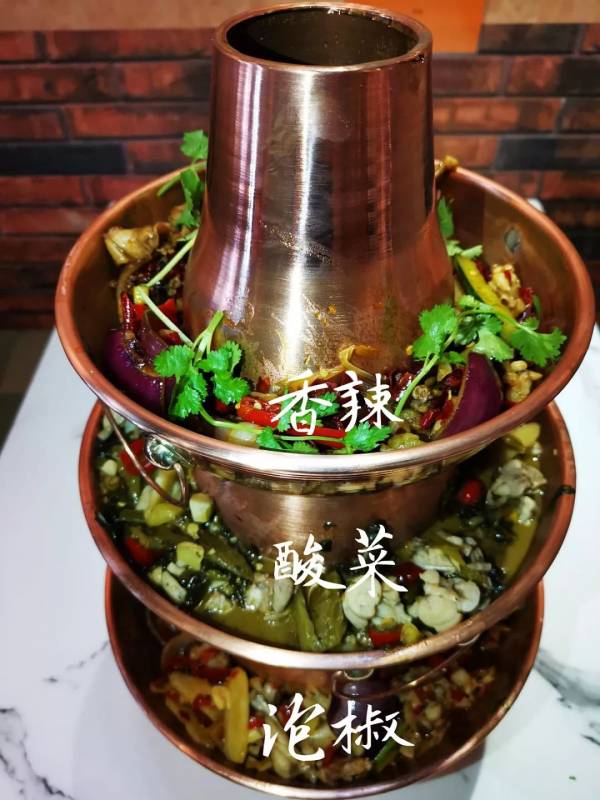 男神同款的三层铜锅近50cm高,炭火保温加热。360°无死角超饱满鲜嫩蛙肉。每层都是对的口味:香辣、泡椒、酸菜、鸡汁山菌。简直是牛蛙爱好者的天堂!