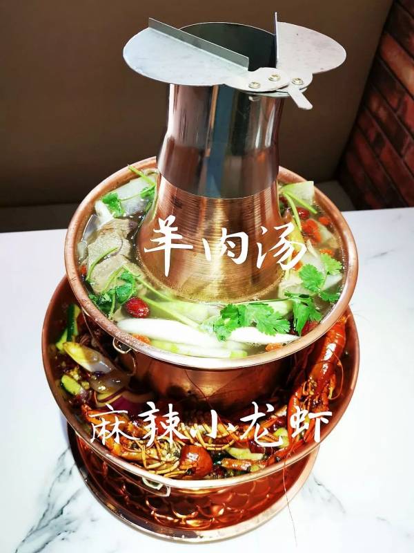 双层铜锅还是一如既往地自带土豪属性,上层是清炖羊肉,下层是人见人爱的小龙虾。