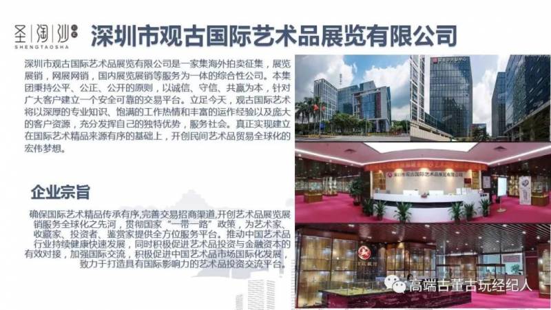 深圳市观古国际艺术品展览有限公司是一家集海外拍卖征集,展览展销,网展网销,国内展览展销等服务为一体的综合性公司。本集团秉持公平、公正、公开的原则,以诚信、守信、共赢为本,针对广大客户建立一个安全可靠的交易平台。立足今天,观古国际艺术将以深厚的专业知识、饱满的工作热情和丰富的运作经验以及庞大的客户资源,充分发挥自己的独特优势,服务社会。真正实现建立在国际艺术精品来源有序的基础上,开创民间艺术品贸易全球化的宏伟梦想。