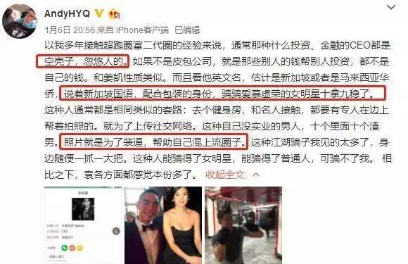 就在大家对这个“开房男”津津有味的时候,中国超跑俱乐部主席黄毅清也跑出来搅和了一下,用他富二代圈多年的经验告诉吃瓜群众们,“这种自己没实业的男人,十个里面十个渣男。照片就是为了装逼,帮助自己混上流圈子”。