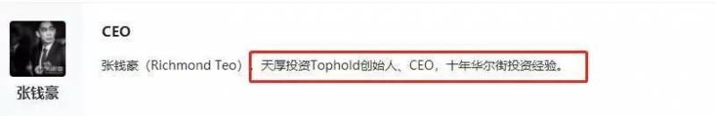 通过工商信息查询工具天眼查查询发现,张钱豪不仅是路思通的高管,还是天厚投资Tophold的创始人、CEO。信息中显示有十年华尔街投资经验。这与袁巴元朋友圈公布的截图信息相符。