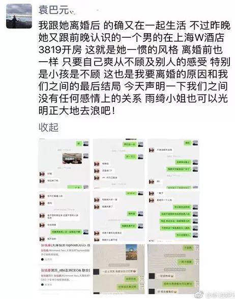 2019年1月6日下午,张雨绮第二任前夫袁巴元朋友圈曝出,他与张雨绮离婚后又同居。但雨绮在这期间和刚认识的某金融才俊去开房。