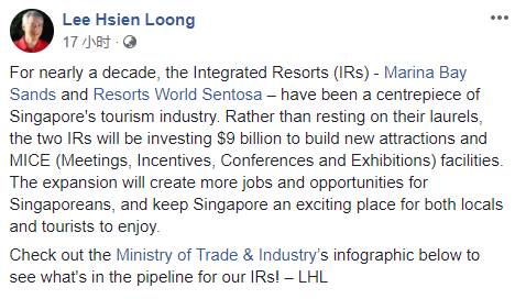 有鉴于此,新加坡总理李显龙也在脸书上发文肯定了滨海湾金沙和圣淘沙名胜世界对于新加坡的重要性。