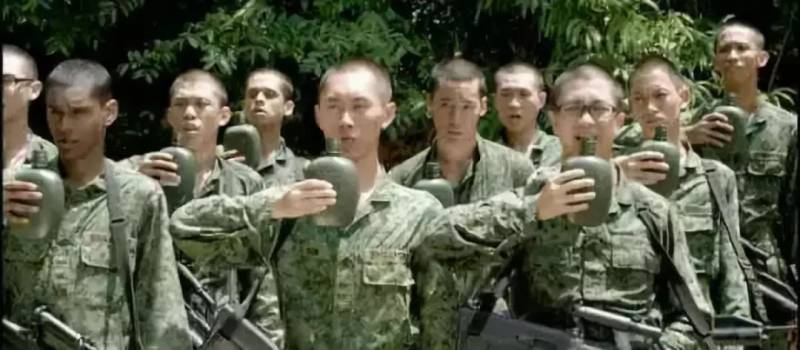 (新加坡军队要求士兵经常补水预防中暑—–图片来自电影《Ah Boys to Men》)