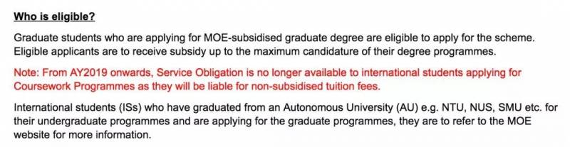 从2019年起,教育部补贴仅适用于新加坡公民和新加坡永久居民(SPR)学生。除申请拉惹勒南国际研究学院(RSIS)的国际学生仍有资格获得教育部补贴,申请其他专业的国际学生将不再享有教育部补贴。
