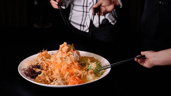一桌子的人一起用筷子把鱼生高高夹起,夹得越高越吉利,祝福来年风生水起。