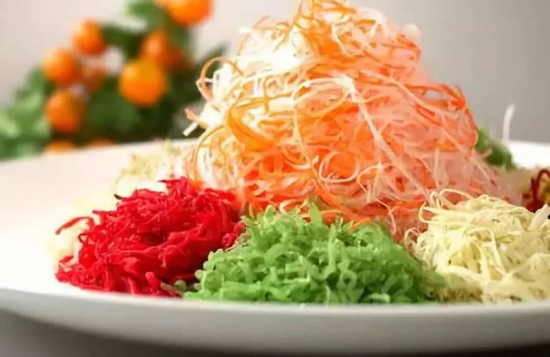 在新加坡过年不管是出去外面下馆子吃饭还是公司吃年饭,都会有的一个习俗就是捞鱼生。就是用新鲜生鱼肉,配以瓜丝,水果丝和各类蔬菜。在餐馆的话,还会有服务员上来,每一份配料放进去的时候,都会有一句吉祥话。捞鱼生的寓意就是来年风生水起,步步高升。