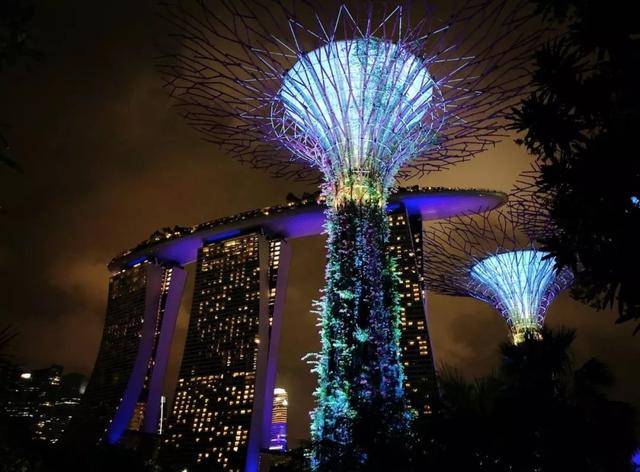 在晚间19:45与20:45,分别有两场超级树灯光音乐秀。在温润的夜晚,躺在地上,仰望超级树霓虹闪烁,旁边就是闪亮的地标建筑金沙酒店,超有意境。一场美轮美奂的灯光秀让人瞬间觉得值回了所有票价。不过如果不购票,也是可以散步滨海湾花园,观看灯光秀的。