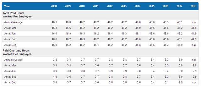 根据MOM的数据,新加坡人的正常工作时间从2010年的峰值46.6小时降至2017年的43.2小时。实际工作时间也从2010年的45.6小时下降到2017年的43.0小时。