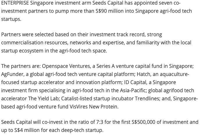 新加坡国际企业发展局(Enterprise Singapore)旗下投资公司SEEDS Capital,委任七个伙伴联合投资食品农业科技起步公司,初始投资额超过9000万新元。
