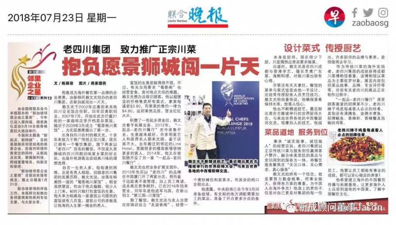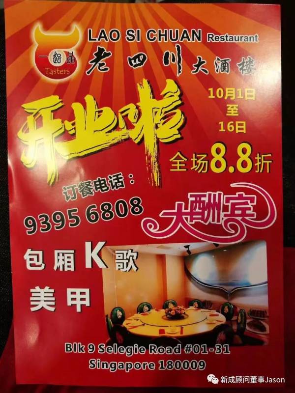新加坡【老四川大酒楼】地址:【Blk9 selegie rd #01_31sg 180009】是赖文光先生创立的,这家酒楼菜系美味,是很多居住在新加坡或者是前来新加坡商务旅行人士的好去处,这里可以聚会,举办生日party,公司年会,庆功会等。这里的服务也是绝对的一流,特别人性化,您在这里不仅可以享受美食还有女士特别喜爱的免费美甲。省去了您逛美甲的时间,也是老板为高端人士考虑,节省宝贵的时间。