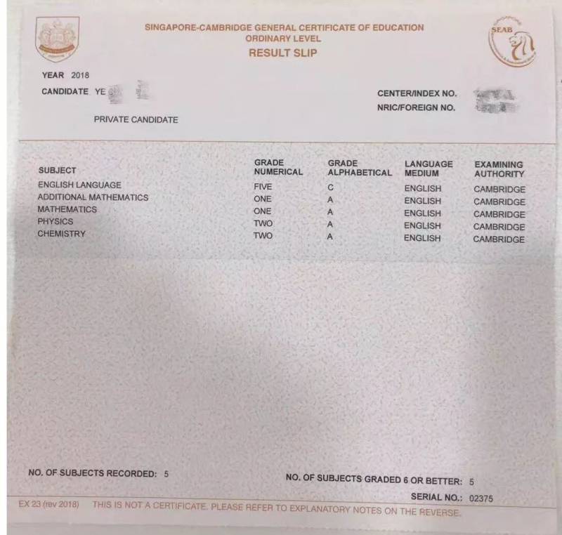 2018年GCE“O”水准成绩出来了!恭喜我们的叶同学考出英语5分,总分10分的优异成绩。学生在拿到成绩单后,第一时间联系了我们,他的家人的心情也非常激动。