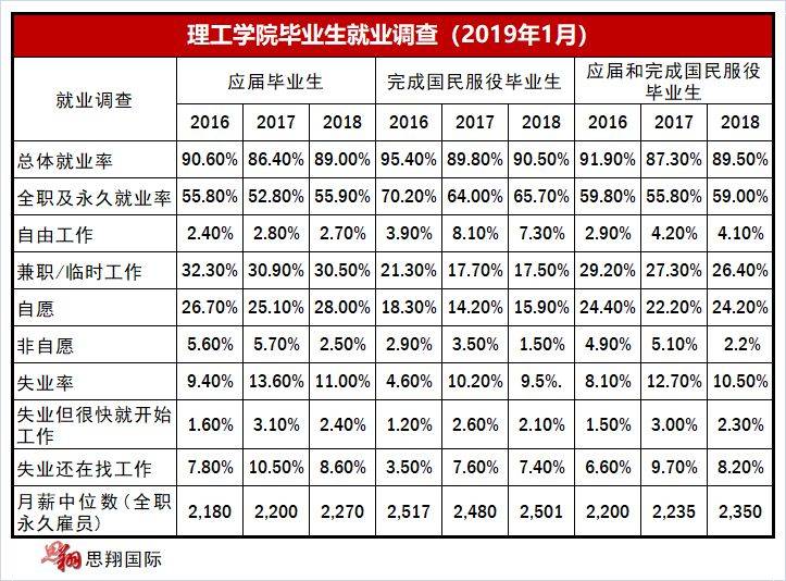 从事自由工作的比率达4.1%,与前年的4.2%相似,打兼职工的毕业生则占26.4%,稍低于前年的27.3%。另外,毕业生的月薪中位数也从前年的2235元增加到去年的2350元。