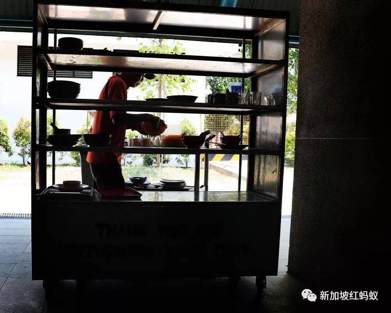 清洁工人在食阁收拾碗碟。(海峡时报)
