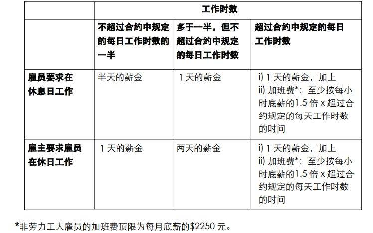 根据政府规定,雇员每个星期可享有1 天的无薪休息日。此休息日可以是星期天或1 个星期的任何1 天。如果雇主没有办法给予轮班工作的雇员一整天作为休息日,也可以给于雇员连续 30 个小时作为休息日。