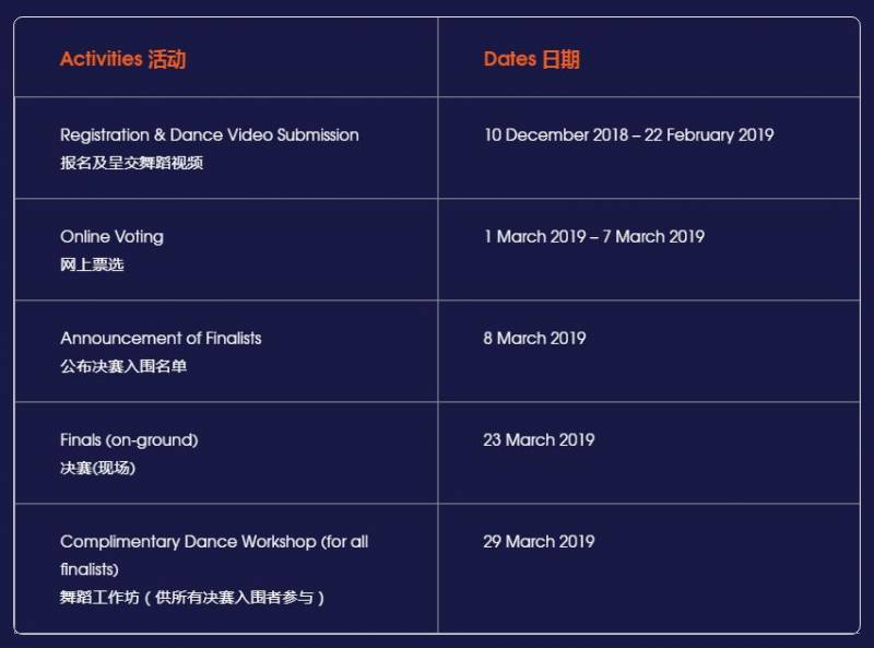 参赛团队须录制一个80 至90秒的编舞视频以及一段有关团队与舞蹈的30秒华语介绍,并要在2月22日 2359hrs前将编舞视频和华语介绍电邮至 [email protected] 。