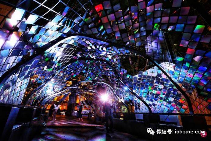 由南洋美专学生创作的“响应桥”位于亚洲文明博物馆前,闪烁的亮片在阳光中光芒四射,天色渐暗时投射出绚丽迷人的灯光。(严宣融摄)