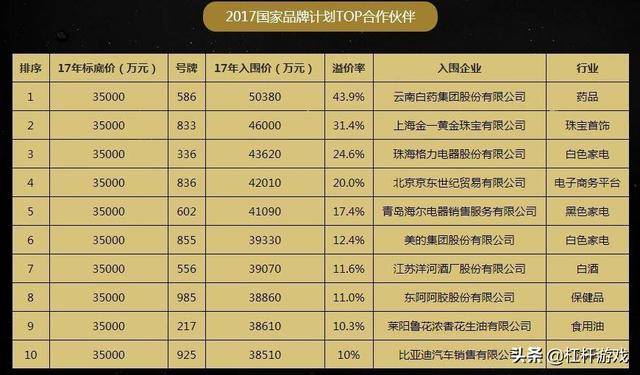 “2017国家品牌计划TOP合作伙伴”入围价,最高的是云南白药,50380万元,然后排第十的是比亚迪,38150万元。