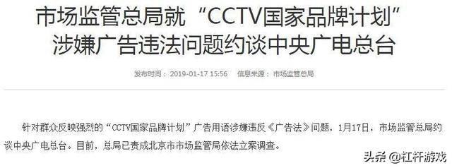 针对群众反映强烈的“CCTV国家品牌计划”广告用语涉嫌违反《广告法》问题,市场监管总局约谈中央广电总台。目前,总局已责成北京市市场监管局依法立案调查。