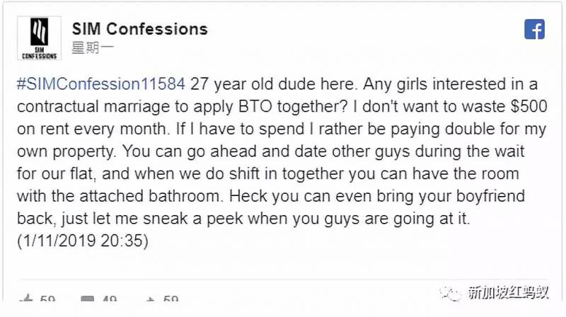 “本人为27岁男性,寻找女生有兴趣进行“合约婚姻”,一起申请BTO。我不想每个月花$500租房子,如果一定要花这个钱,我宁愿付双倍以拥有自己的房产。在等待房子建好期间,你可以跟其他男生约会;当我们一起搬进新屋之后,有厕所的房间可以归你使用。你要把男友带回家也没问题,只要让我偷窥一下就可以。”