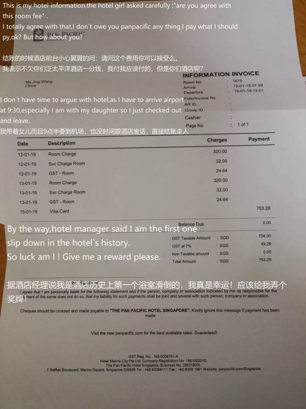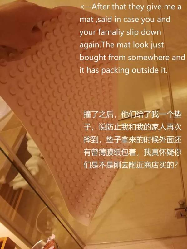 酒店的浴室没有任何防滑警告语,没有防滑垫,甚至没有扶手,不幸摔倒猛烈撞击头部,酒店不但不负责,甚至连基本的帮助都不肯,好不容易就医做了CT,其对待我们中国公民的说话态度和处事方式更是让我们心寒,如果这就是新加坡旅游的话,我希望各位爸爸妈妈,引以为鉴,别让出门的开心,变成了回国的伤心。