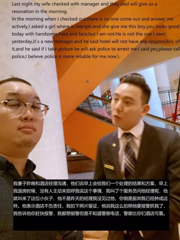 是的,他们酒店的GM态度很差....我怼他的时候,总是翻白眼....表现出来一副很无奈的酱紫.....当时我朋友入住一个星期,前台说免费给提升房型。当时我选择了带早餐的......结果退房时候就说升房型要付费,你不能太好说话...态度一定要坚决。多一是不如少一事,这个心态不能有。不过我还觉得只是针对事件就好,你这事情要找总理....我觉得你找大使馆还靠点谱...庇护中国公民,也是大使馆的责任,你看看啥结果。