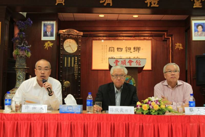 2011年总统竞选期间,候选人陈庆炎在宗乡联合总会会长蔡天宝陪同下拜访华社,对自己的竞选进行演说。