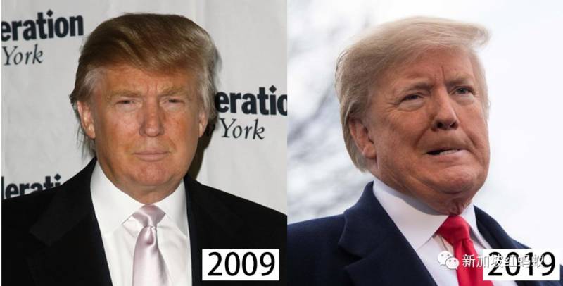 估计特朗普应该也是皮肤色素喷雾剂的使用者,而且很可能是那种连牌子都没换过的死忠粉丝。如果真要找出变化,应该就是头发换了个方向梳。