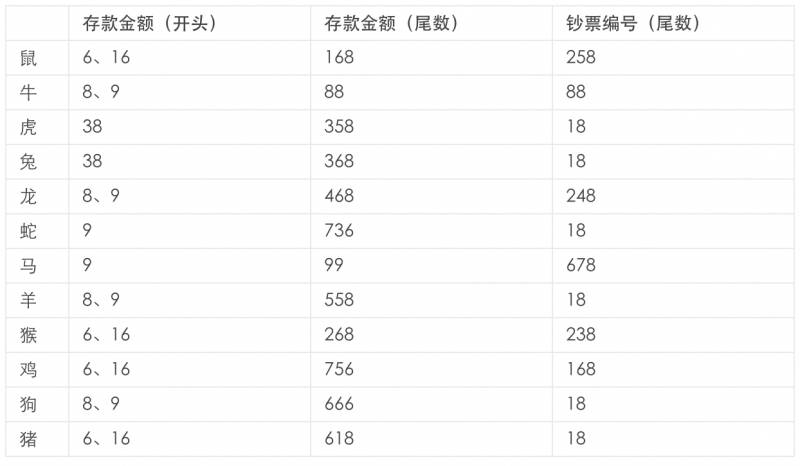 “像来年财运好的肖鼠者,可选择钞票编号尾数’258’,而另外两个财运也不俗的肖龙和马的朋友,分别可选择尾数’248’和’678’的钞票。面值和钞票新旧都无所谓。”