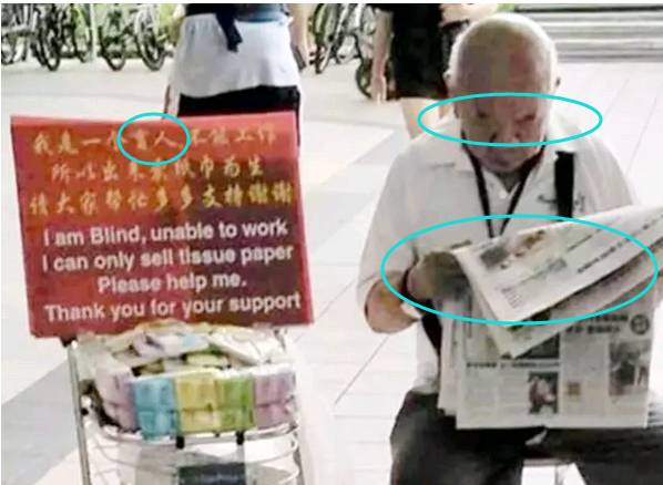 就是上图,一边看报纸...一边卖报纸...一边说自己盲人...打着感情牌....