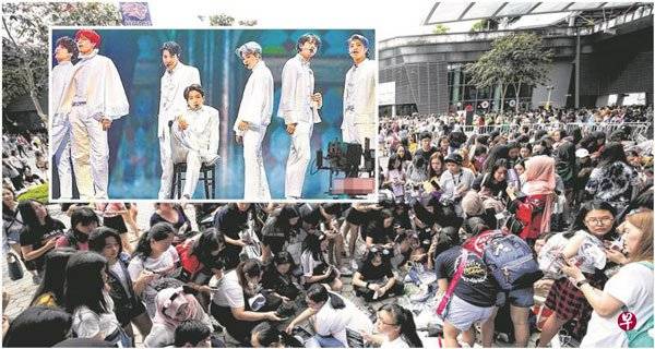 韩国男团“防弹少年团”(BTS)今晚将在国家体育场开唱,大批热情粉丝昨天一早已提前排队,只为抢购团体的周边商品。